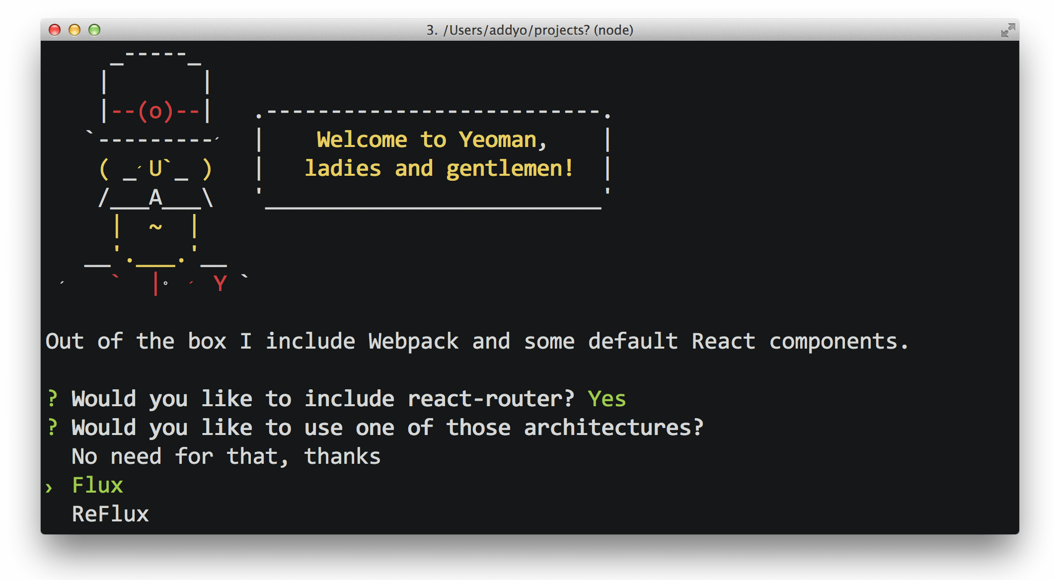 Three new generators for quickly getting started with React are out: React and WebPack (recommended, with support for Flux and react-router), React and Flux (with Browserify), and React and Meteor.