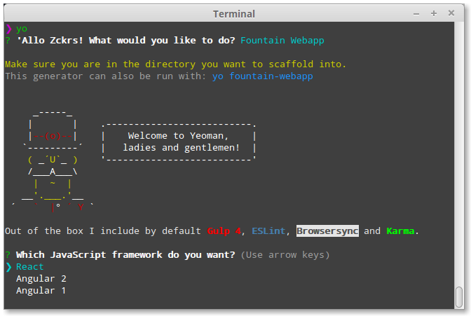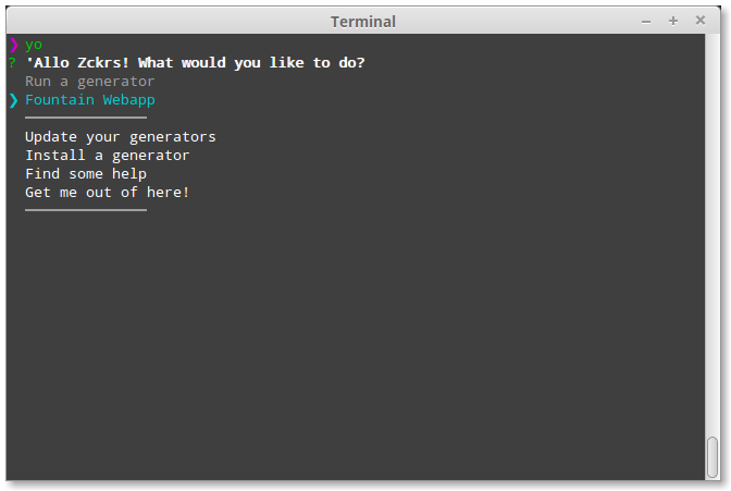 If you have a few generators installed, you’ll be able to interactively choose from them. Highlight Fountain Webapp. Hit enter to run the generator.